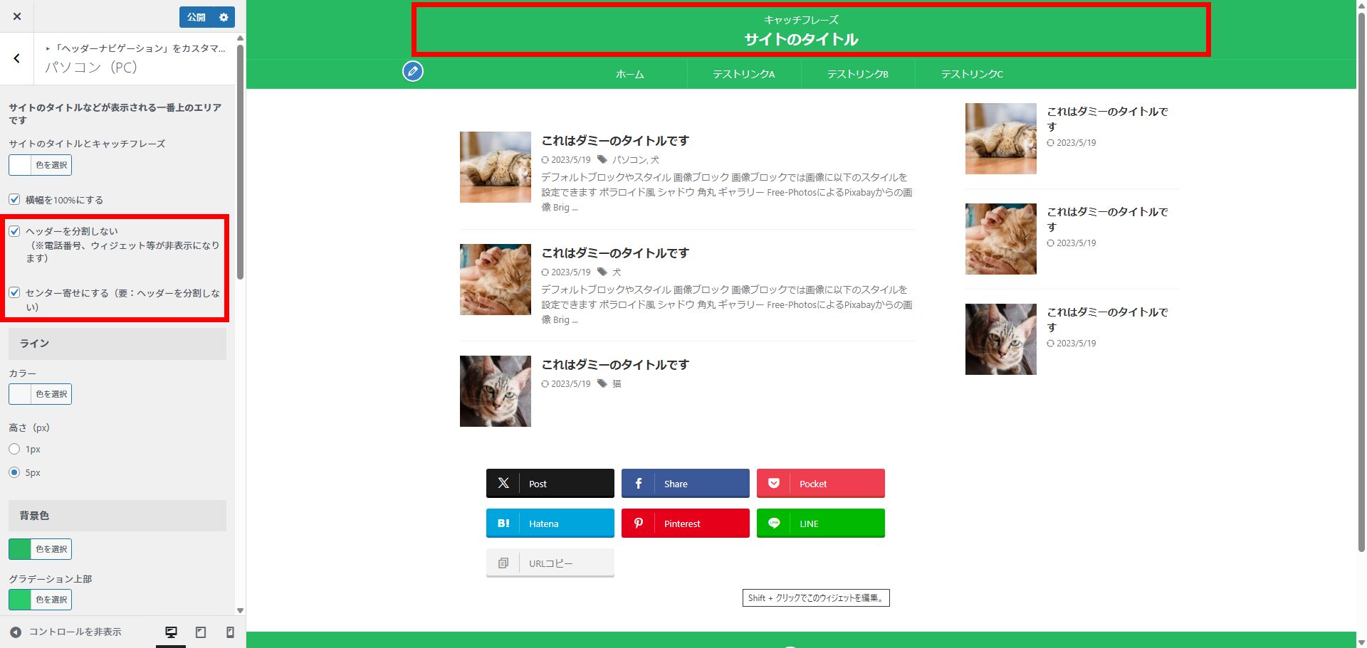 「ヘッダーを分割しない」「ヘッダーナビゲーションをセンタリング」をカスタマイザー設定に移動する